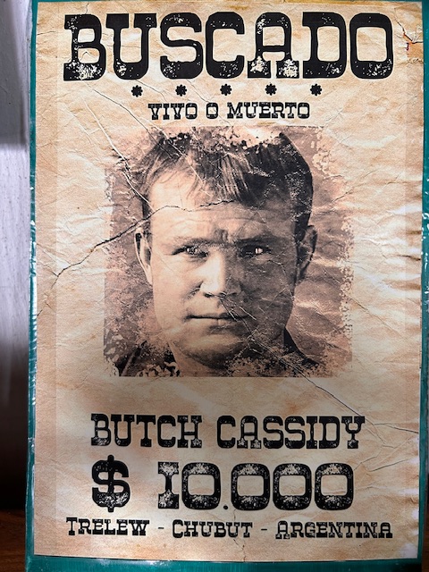 Pludselig på vejen er opsat t lille Butch Cassidy skilte, og vi stopper. Det var her de 2 sidste legendariske western legender flygtede til i 1901 og indtil 1906. Dengang var dette øvre del af Patagonien meget øde, og kun få havde bosat sig, så hertil flygtede de 2 røvere der var eftersøgt i USA, i et forsøg på at leve i fred. De boede her og fik bygget dette hus, og stald, -med 6000 hektar. De levede sammen med befolkningen dernede, inden de blev opdaget af USA rangers og måtte tage på deres sidste røver/drab flugt. Det var sjovt nok den lokale sheriff der advarede dem, så enten var deres penge vellidte, eller måske var de ligefrem vellidte.
