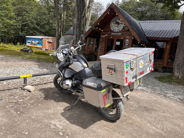 Det er skrevet før, -men det blæser her i Patagonien hele tiden fra Vest mod Øst, så mange træer må bøje sig.En forladt by. Gårde, butikker, kirke, skole, havn – spøgelsesagtig suser vinden 😉Får lever der hvor det er muligt, og her bliver 1000vis drevet hjem mod Estancia for at blive sommerklippet.Kokkens køkken. Colemann benzinbrænder, da benzin kan fåes overalt.Kongepingviner. De er her ved Magallan strædet for at yngle og spise sig fede. Den ene passer ægget, mens den anden spiser i havet – efter 7-10 dage bytter de. Disse er store, kan veje 18 kilo og blive 1,2 meter.Det her drejer sig om hvem der bestemmer og gøre sig flot.Godt med en dukkert, når man får det varmt.En mand der ikke kan fange fisk står der til ingen nytteEn øde grænseovergang på Ildlandet der er delt mellem Chile og Argentina 1st punktering, og herude uden dækning er det godt at have reservehjul. En venlig lastbil chauffør kommer forbi fordi herude stopper man.View over en del af Ildlandet vi har passeret. Aller bagerst kan anes Andes – flot – og dragende Juhuu – vi når Ushuaia efter ca. 5500 km Når der ikke er plads i sidetaskerne, må man have en topboks på :-). Dette sted er et MC mødested ved Ushuaia som fungerer som rejse mission udført. Ushuaia fiskebåde i brug og en trawler der er opgivet (for mange år siden)Igen en opgivet fiskebåd. Bagved ses den helt nye turist industri, som er eksploderet! siden vi var her for 8 år siden. Turister flyver hertil, og sejler på krydstogt til Antarktisk – og det koster vist kassen. Turist tar billede af turist der ser turistbil fra Danmark Ræven er ikke så bange som den er nysgerrige.Alle mulige slags vilde orkideer er her.Her ender rute 3 – her vender man om. Der er langt til den nordlige ende – Alaska – 17.848km.Udsigt ud over Ushuaia, Beagle strædet længere ude Kap Horn